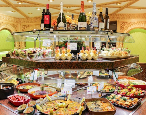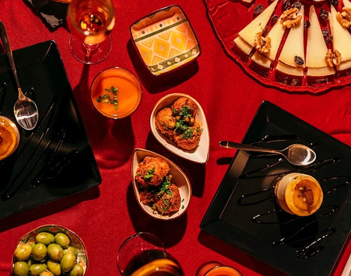Usually a curated 3‑course or tasting-style menu featuring Catalan and Andalusian dishes, including Iberian ham, seafood, paella, artisanal cheeses, and classic Spanish desserts. Vegetarian menus are common, with vegan and halal options available at select venues.