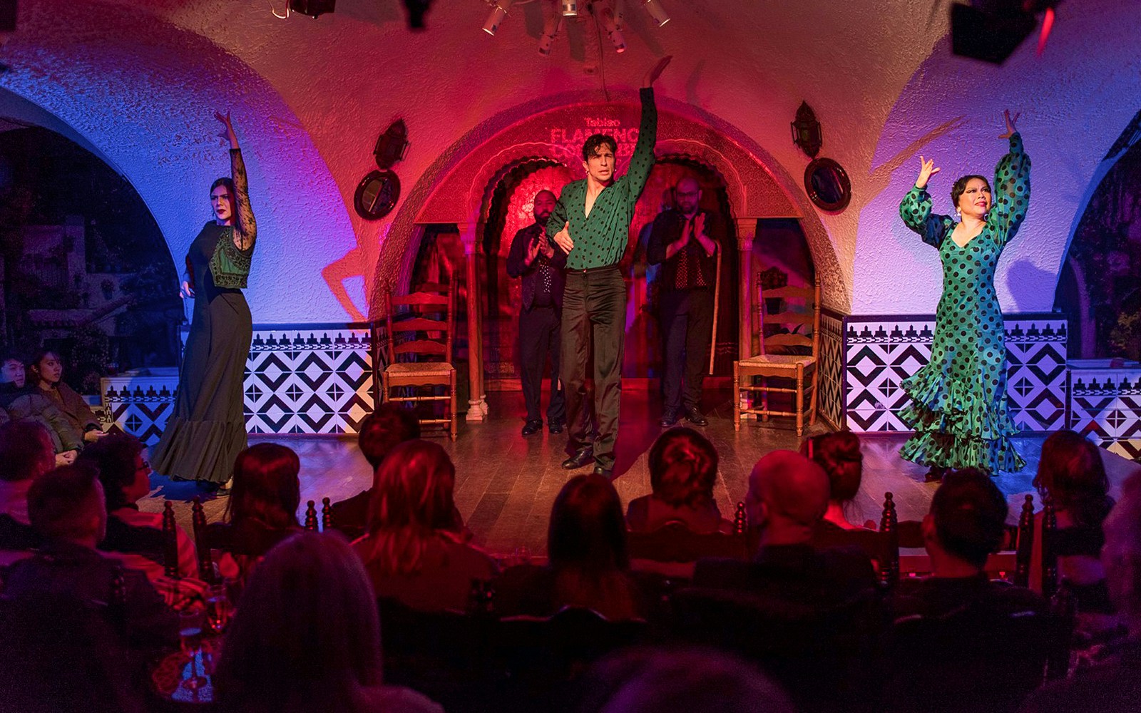 Flamenco hits with fierce precision where dancers stomp with measured intensity, their footwork echoing across the room. Vocals rise and fall with raw emotion, accompanied by guitarists weaving complex rhythms. Every movement, from a subtle hand gesture to a dramatic turn, tells a story steeped in passion and history, drawing the audience deep into the performers' world.